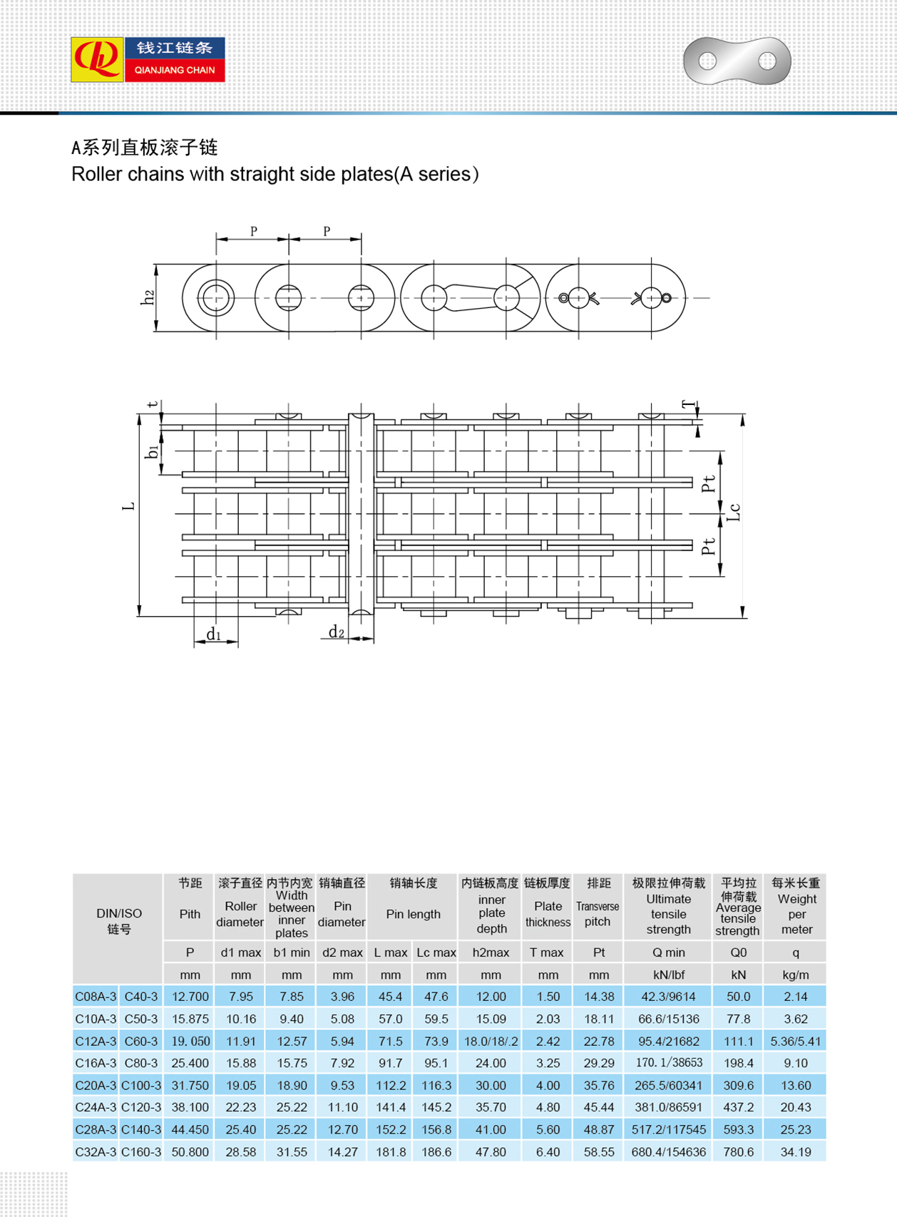 Roller chains with straight side plates (A series) are designed for durability, efficiency, and ease of maintenance. Known for their low noise operation, these chains offer a smooth and quiet performance, making them ideal for environments where sound reduction is important. The materials used in the construction of these chains are carefully selected for their high strength, ensuring that they are less prone to breakage, even under demanding conditions.