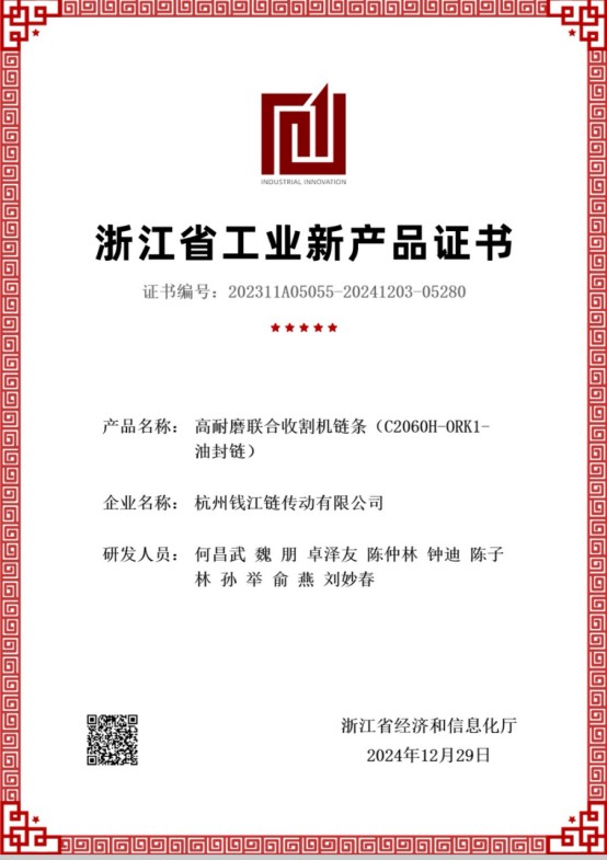 Tested by the National Chain Quality Inspection and Testing Center, the product's tensile strength and fatigue resistance have increased by 25%, and its wear resistance has more than doubled. Currently, it is mainly used in Southeast Asian countries and domestic agricultural machinery markets. Meanwhile, it has been rated as a Zhejiang Provincial-Level Industrial New Product. Welcome to inquire and purchase!